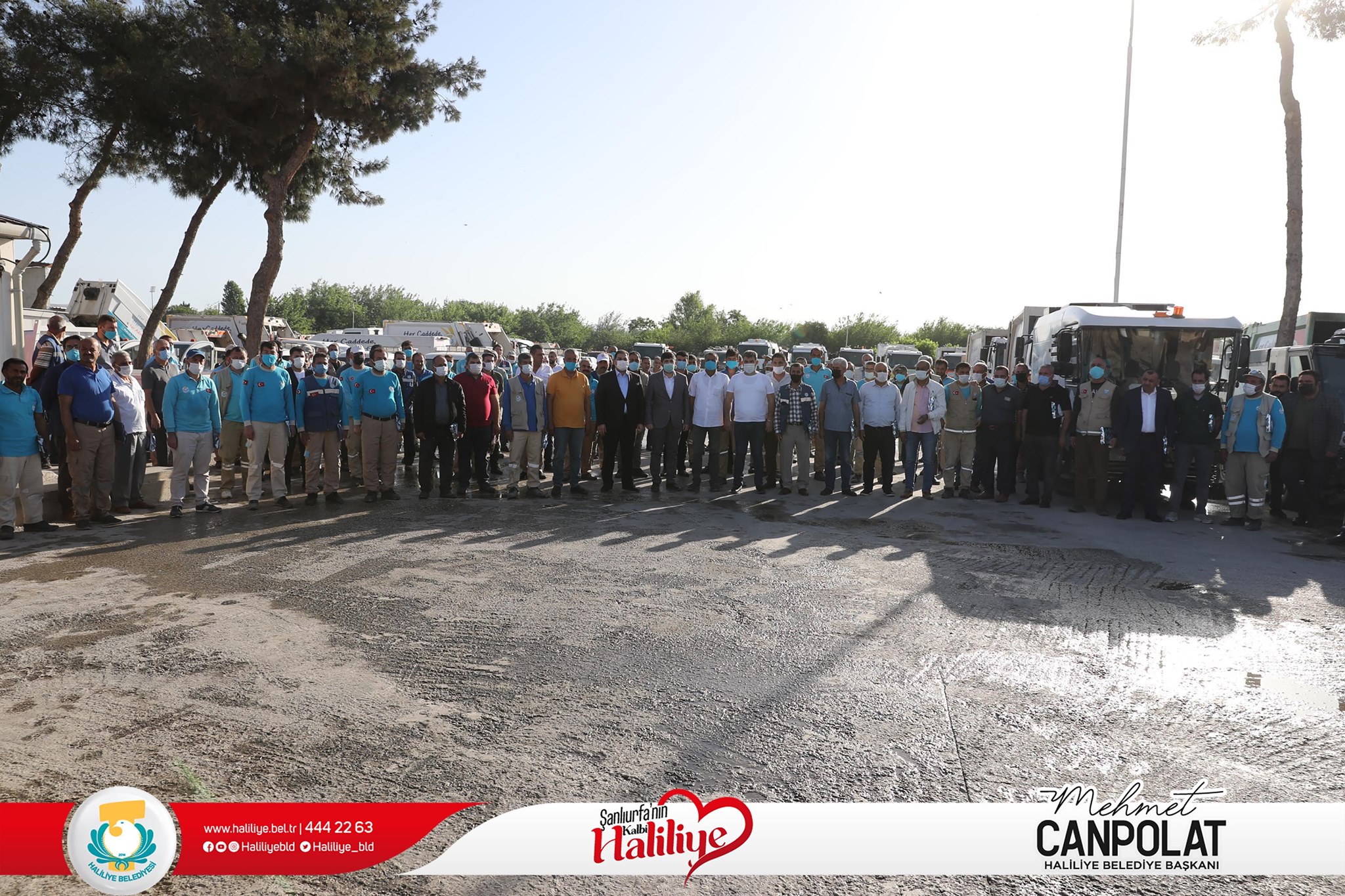 Haliliye Belediye Başkanı Mehmet Canpolat, Ramazan Bayramı dolayısıyla Temizlik İşleri Müdürlüğüne bağlı işçilerle şantiyede bir araya gelerek, işçilerin bayramı tebrik etti.