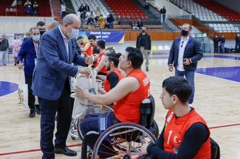 Cumhurbaşkanı Ersin Tatar, KKTC Tekerlekli Sandalye Basketbol Takımı ile Türkiye Cumhuriyeti TSK Tekerlekli Sandalye Basketbol Takımı arasında oynanan lig maçını izledi