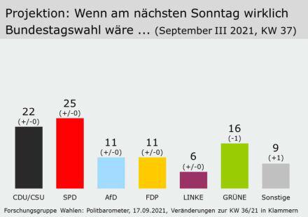 Alman Birinci Televizyonu (ARD) adına yapılan son kamuoyu yoklamasında Almanya’da bu hafta sonu Genel Seçim olsa Sosyal Demokrat Parti’nin (SPD) yüzde 25, CDU/CSU yüzde 22, Yeşiller’in yüzde 16, Hür Demokrat Parti’nin (FDP) yüzde 11, Almanya için Alternatif’in (AfD) yüzde 11 ve Sol Parti’nin yüzde 6 oy alacağı saptandı.